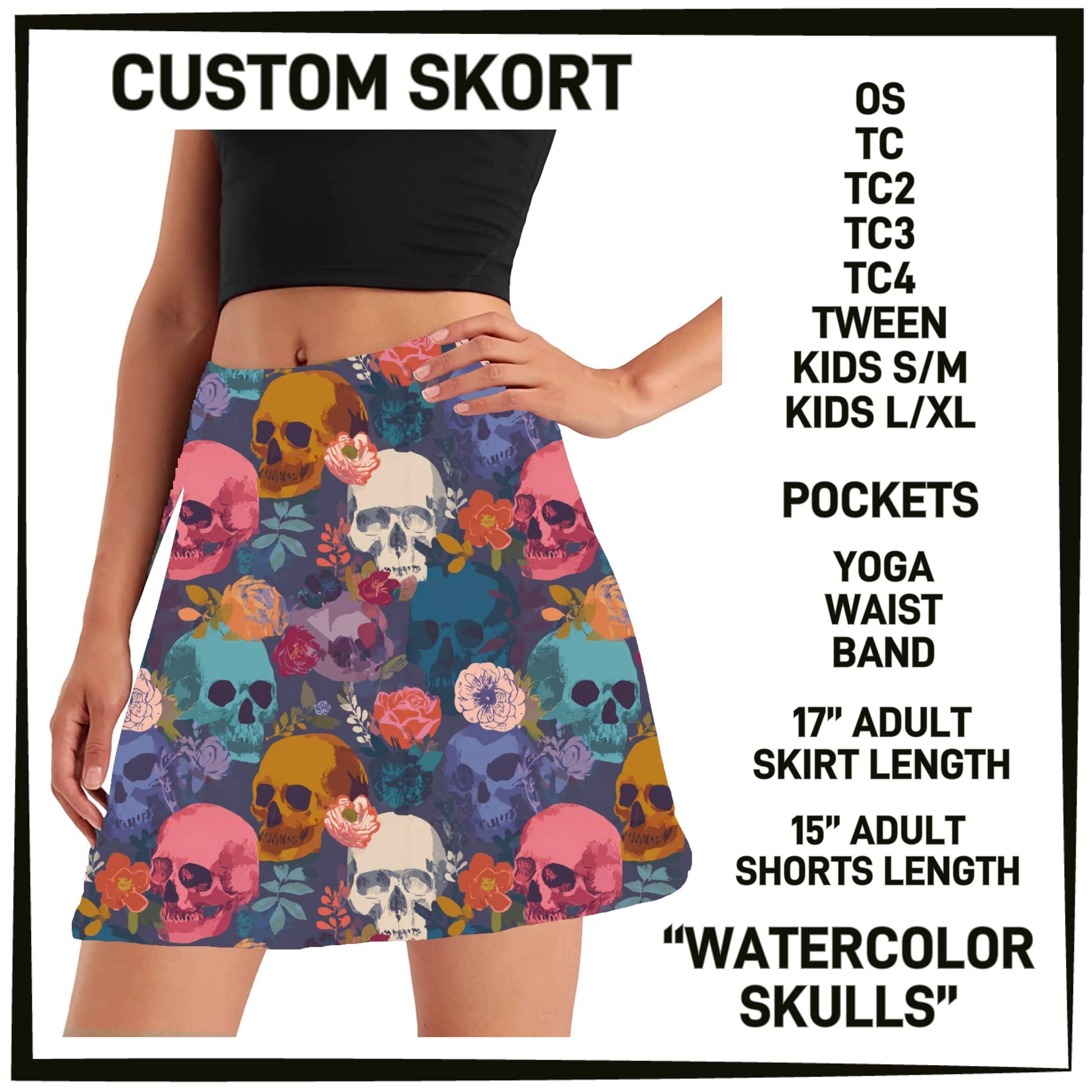 275BT - Watercolor Skulls Skort with Pockets - Preorder Closing 12/14 ETA: Mid-Feb